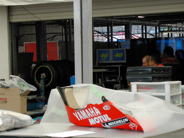 こっちはロッシのピット裏、手前のアンダーカウルはチェカのか?