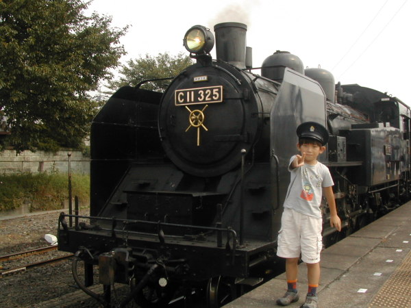 車掌さんの帽子をかぶってピース
